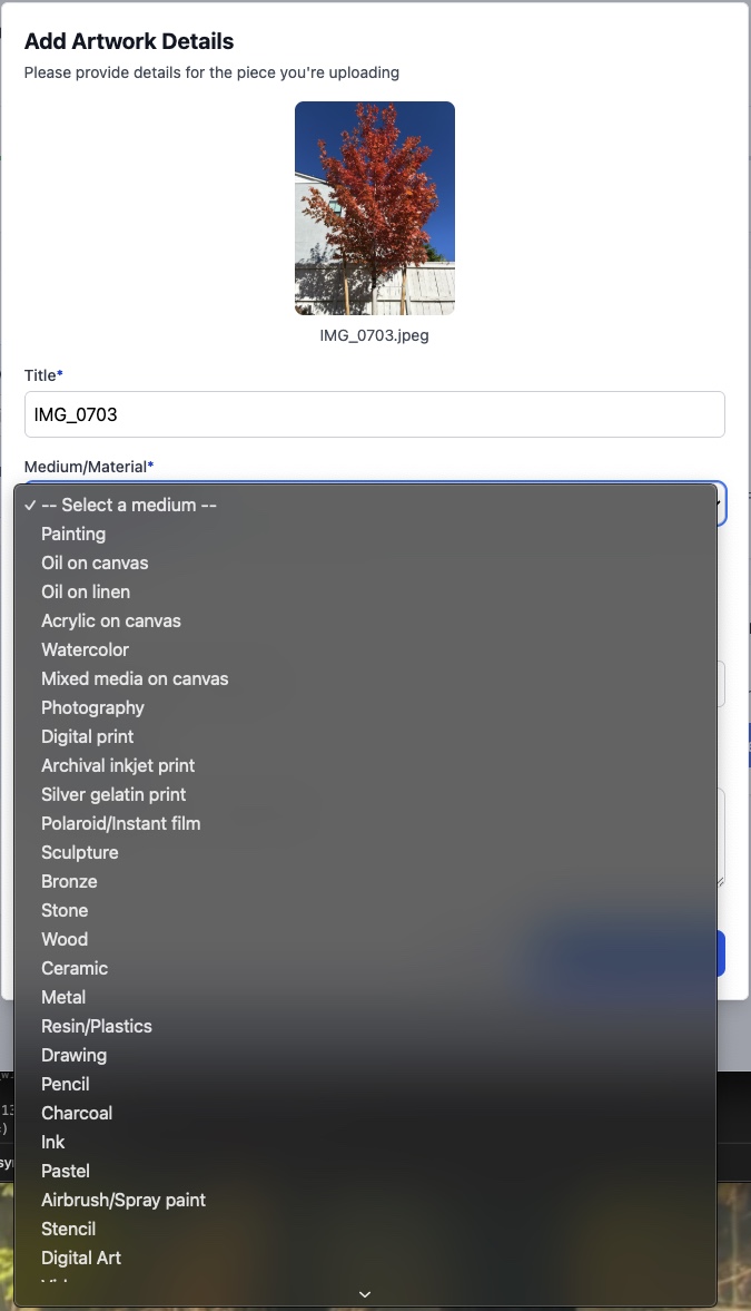 Medium is more self explanatory - it's what your piece is made of! The dropdown menu you see on EntryThingy has 33 pre-selected options for the Piece Medium. When you go to add your art, you will see the option to select what the piece if made out of. It looks like this:
