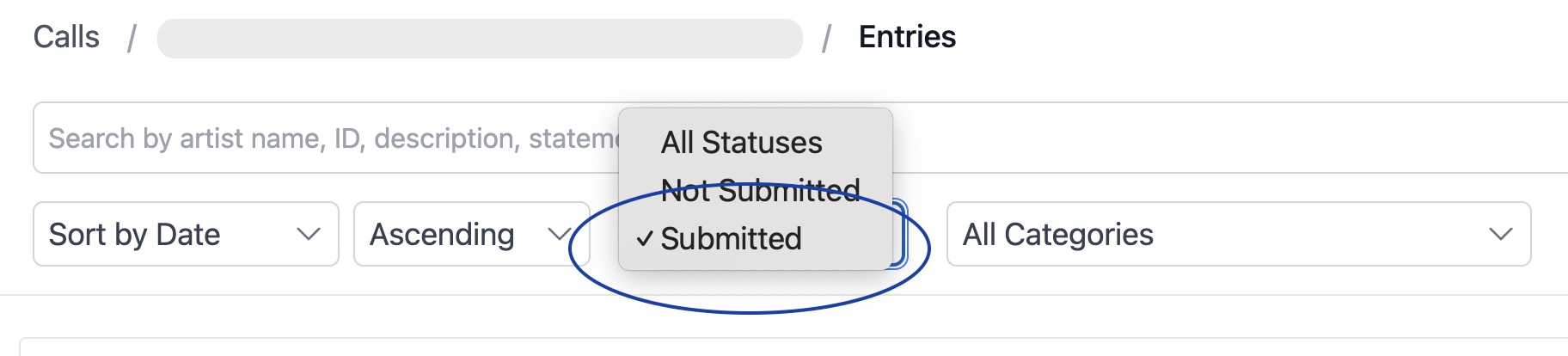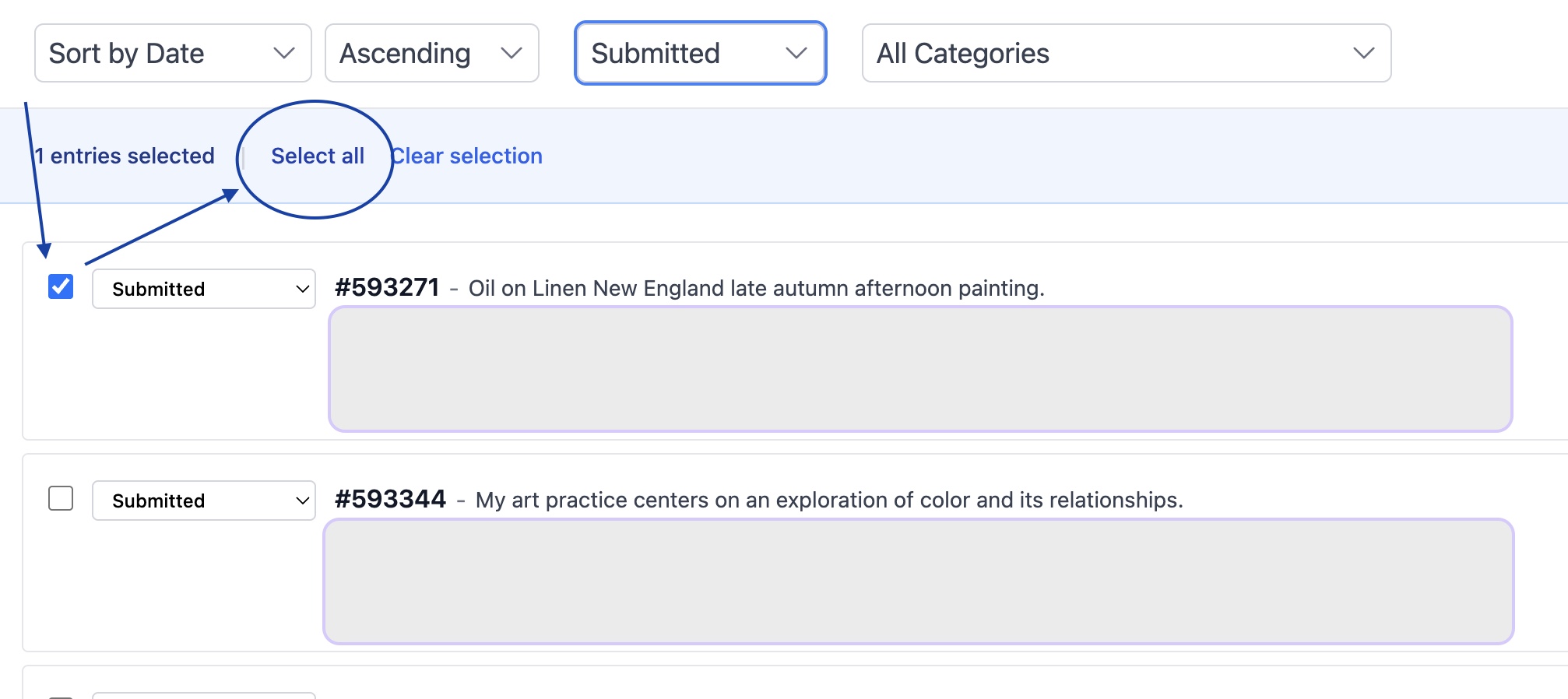 - Filter by the status you want to change. In our example, select "Submitted" from the status filter to view all submitted entries: