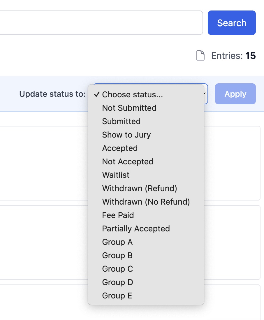 Bulk updates make it easy to manage large numbers of submissions efficiently, whether you're moving entries to jury review, organizing pieces into groups, or updating statuses after jurying.